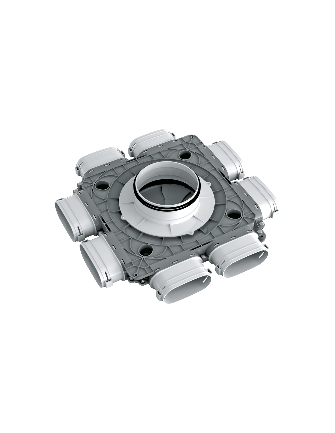 Műanyag légelosztó doboz felső csatlakozással. (160 mm/8x52 mm) Blaufast légcsatorna rendszerrel kompatibilis.